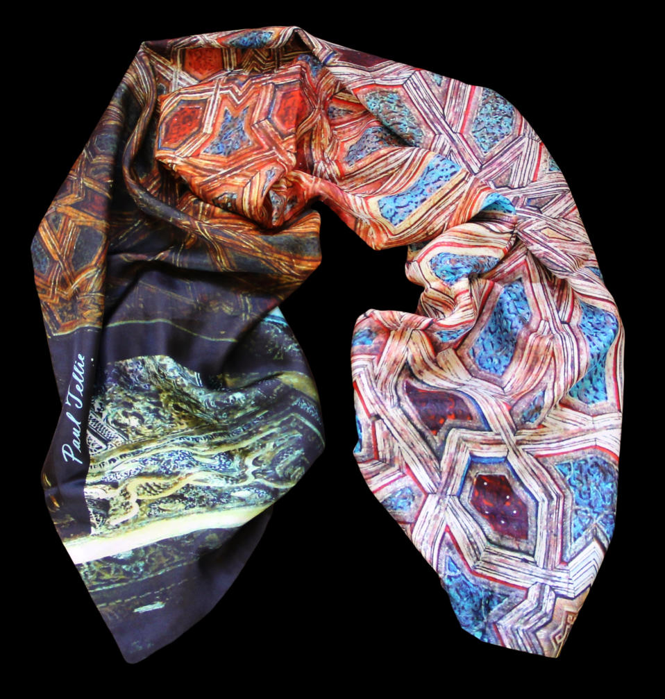 57" x 15 ” / 1450 mm x 380 mm 100% Silk Twill on one side and cashmere on the other.Paul Tellie’s silk scarfs are all handmade from the finest, smoothest, highest quality silk, printed with unique art from our featured designers. All our scarfs are made in limited editions. Scarf quality is a printed silk chiffon , and radiates luxury and style. Depicted on this scarf is a snapshot of a wall painting.